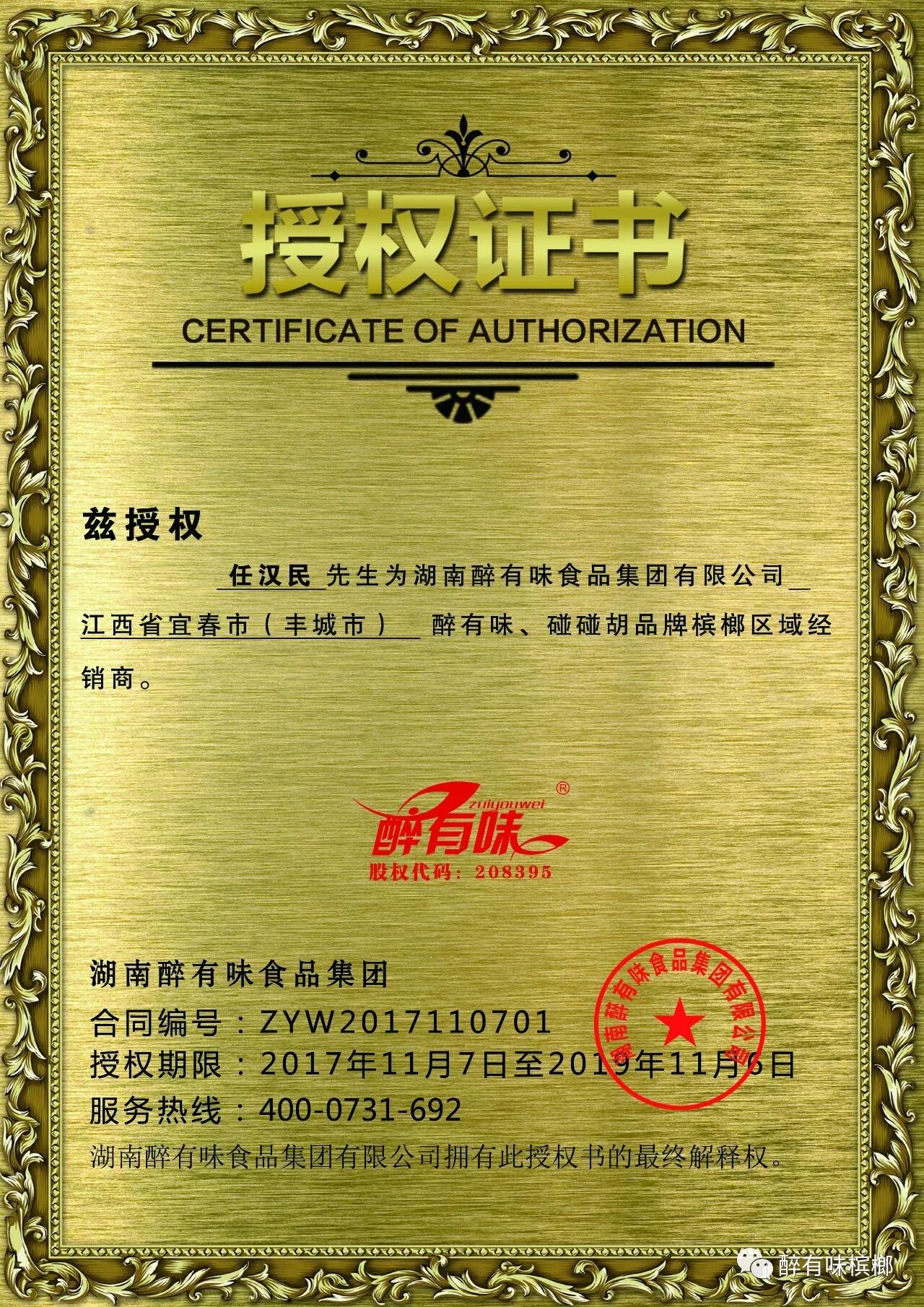 兹授权任汉民先生为醉有味、碰碰胡槟榔江西省宜春市(丰城市)合约经销商
