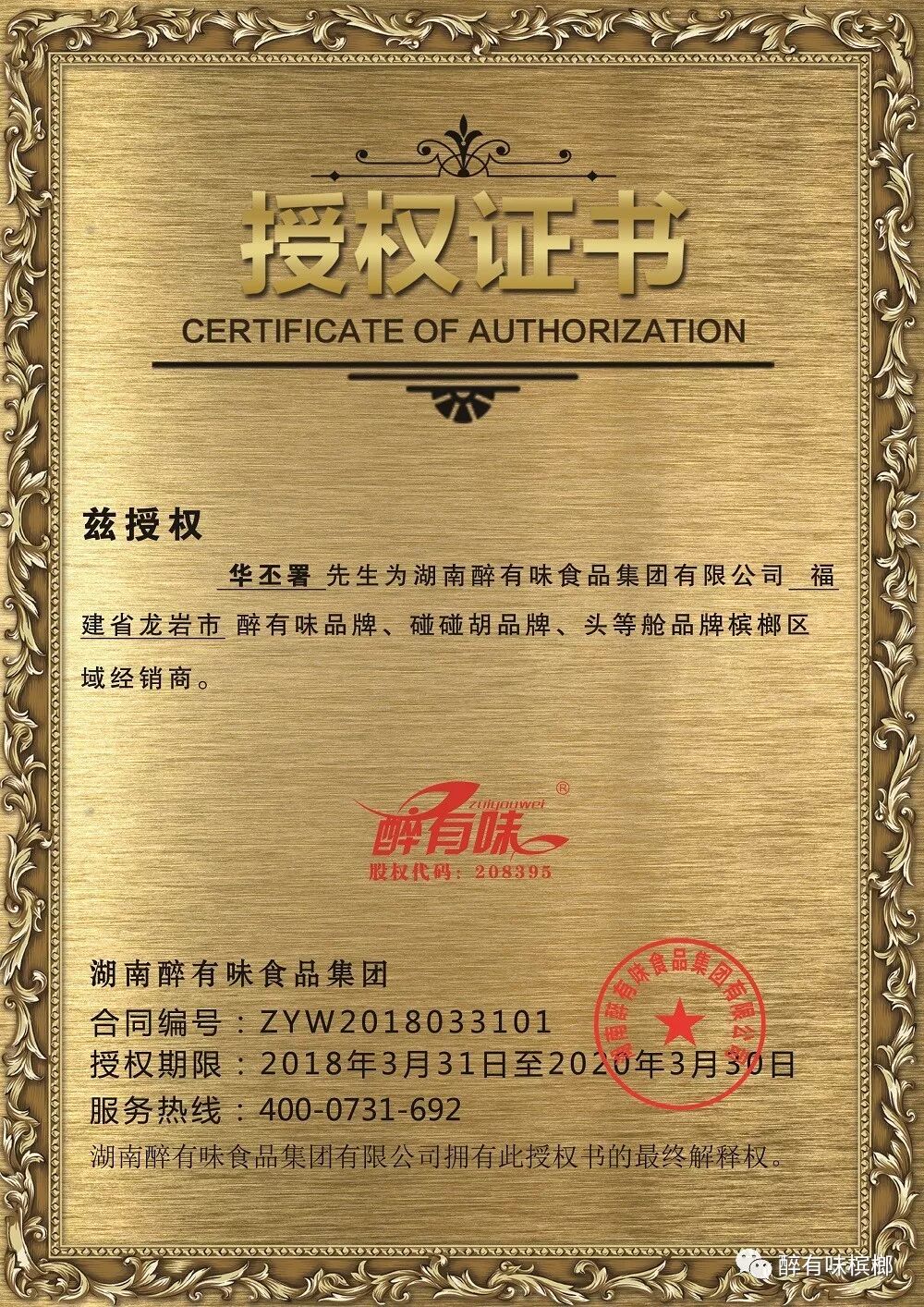 兹授权华丕署先生为醉有味、碰碰胡、头等舱槟榔福建省龙岩市合约经销商