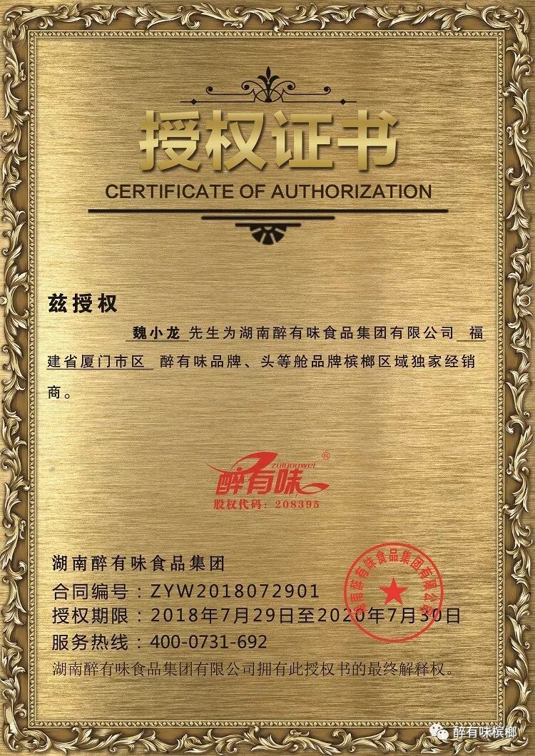 兹授权魏小龙先生为醉有味、头等舱槟榔福建省厦门市区经销商