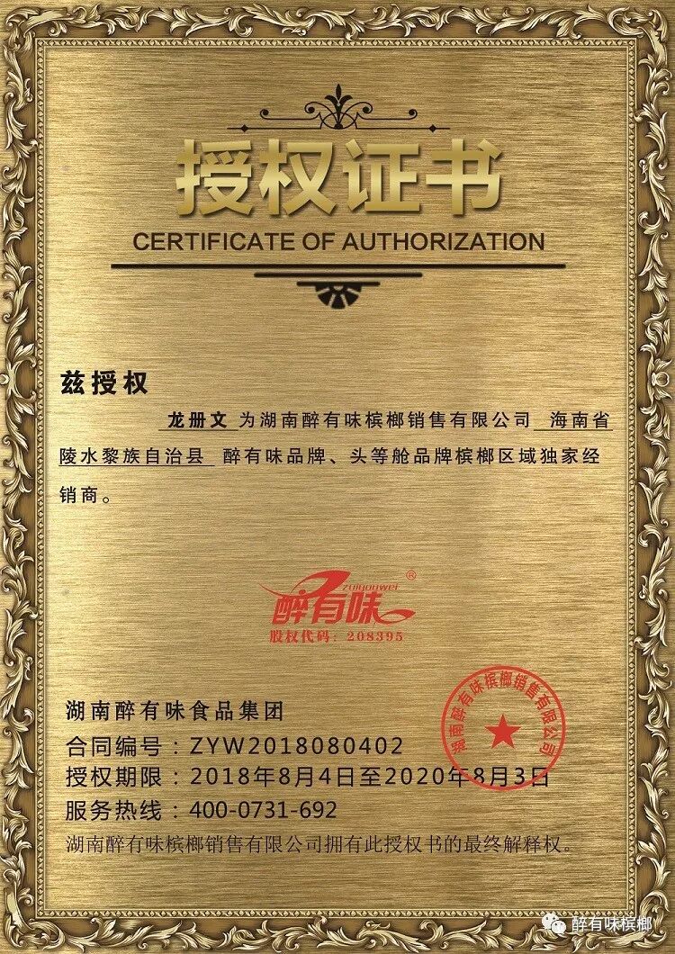 兹授权龙册文先生为醉有味、头等舱槟榔海南省陵水黎族自治县经销商