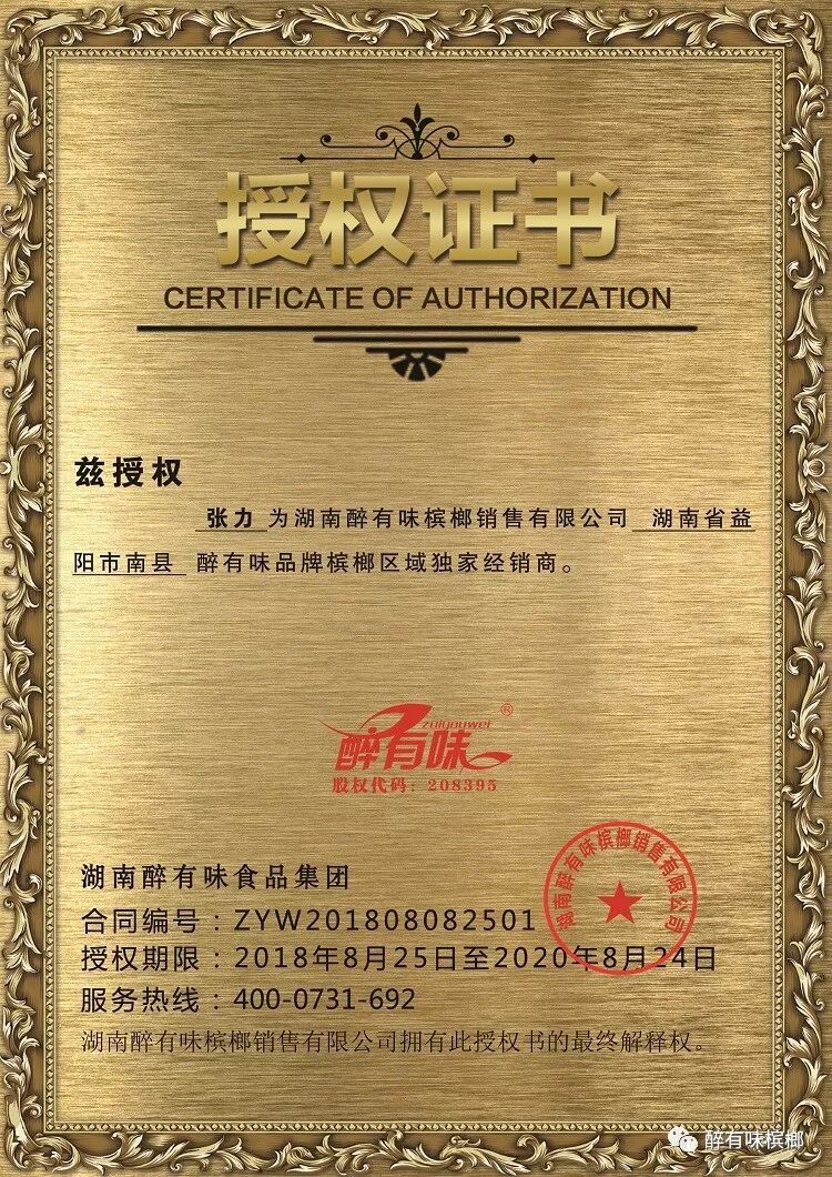 兹授权张力先生为醉有味槟榔湖南省益阳市南县经销商
