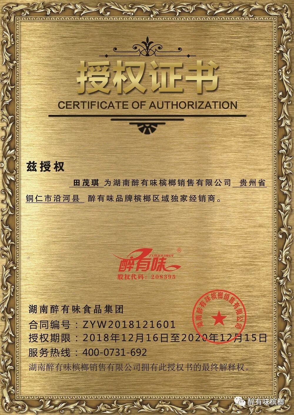 热烈祝贺田茂琪先生成为“醉有味”槟榔贵州省铜仁市沿河县合约经销商
